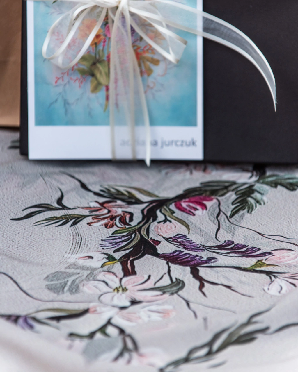 El pañuelo se entrega envuelto para regalo en caja forrada con moño de cinta de organza