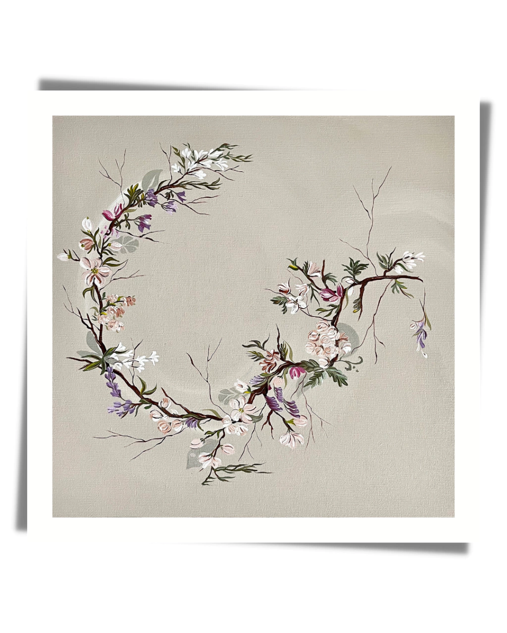 En este caso la reproducción de una obra pintada sobre lienzo con acrilicos, en donde las pinceladas y las flores arman una ronda jugando un lindo juego...